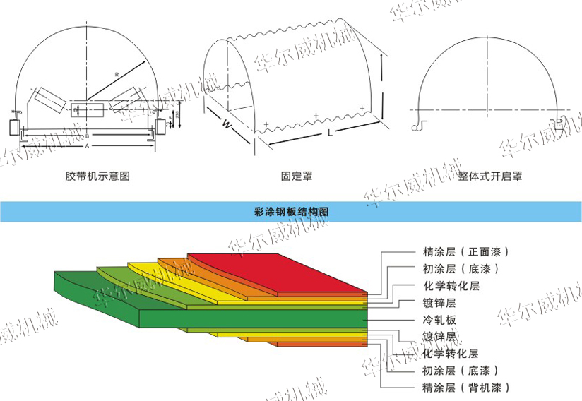 本公司生產的彩鋼板防雨罩適用于各種工況條件下的皮帶機罩殼,DTII、TD75、DJC、QD80型全系列皮帶機彩鋼板防雨罩。適用于B500、B650、B800、B1000、B1200、B1400、B1600、B1800、B2000等系列皮帶機,大致分為固定罩、開啟罩、跑偏開關罩三類。顏色天藍色、海藍色等。量大可以訂制特殊顏色。廣泛適用于電廠、水泥廠、煤礦等各大廠礦企業的輸送帶的防雨、防塵、防風,貨物在傳送過程中減少損失,使輸送帶在運行中更為可靠,區別于傳統彩鋼板防護,對凈化環境起到很大的作用。有固定式、開啟式還有帶觀察窗,可以看到物質在傳送過程中及傳送帶運行是否正常,更有跑偏罩,為設有跑偏開關的輸送機起到防雨、防塵等作用。